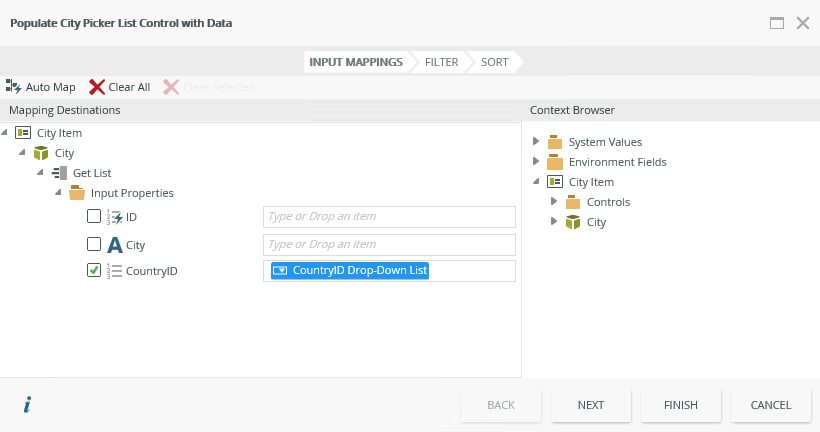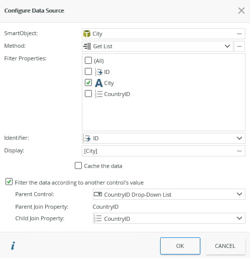 | Child Join Property (CountryID of the City control) | The SmartObject property on the current (City) control that is used to filter the data. This property links the parent data to the child data and needs to match the parent join property such as using an ID property. |