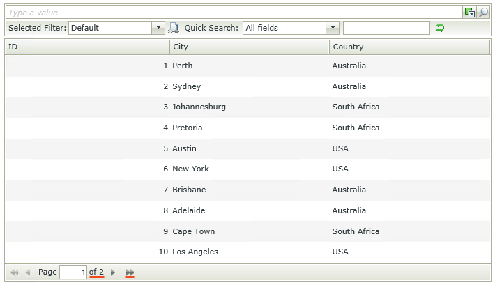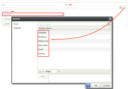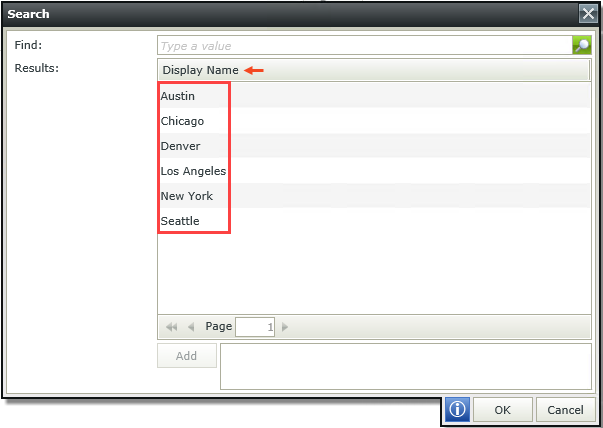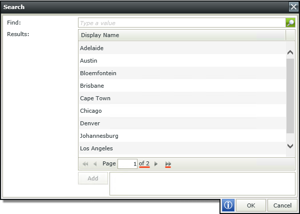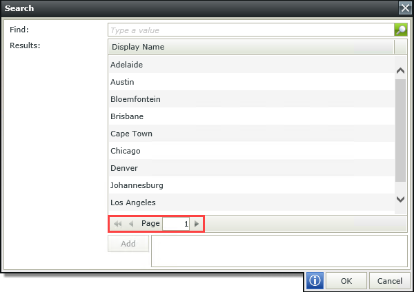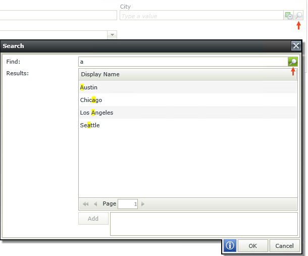 - Search: Data is requested when you click the search icon on the search page. A contains filter is applied to all the filter properties. Paging applies based on the Page Size property of the control. See the Web.config entries section for how to show the total number of rows at the bottom of the search dialog.