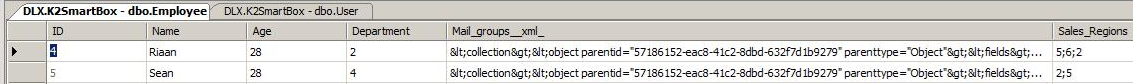 Depending on your solution requirements and preferences, you can select to save multiple values as XML or a delimited string. If you want to save multiple values as XML, you must enable the Allow Multiple and Save as XML properties under the Details of the Properties section. When you do this, the values are saved in XML format in the database. When you enable the Allow Multiple property and specify a delimiter, the values are saved as a delimited string in the database. In the example below, the Mail_groups__xml_ field shows values saved as XML and the Sales_Regions field shows values saved as semi-colon delimited.