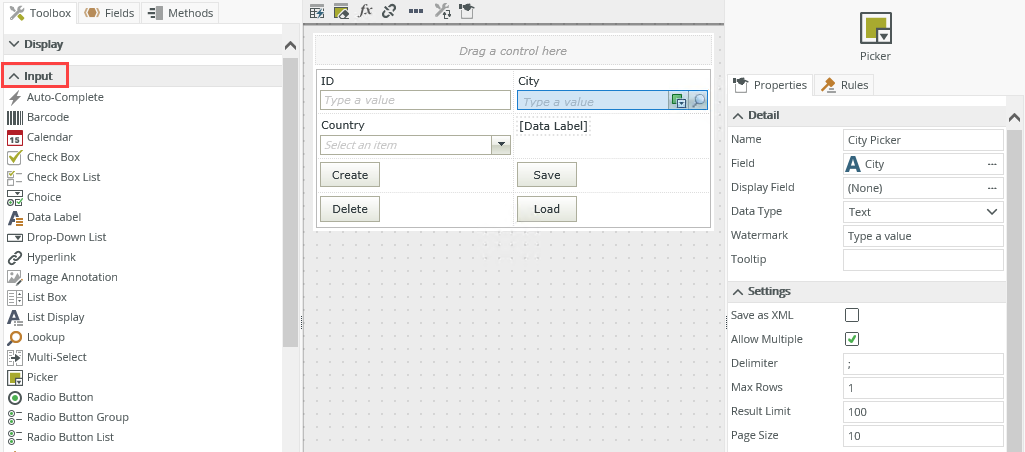 - Drag the control onto the canvas. You can find the control in the Input section of the Toolbox.