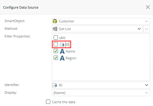 - If a SmartObject property is NOT used as an output (return) property in a method linked to the SmartObject, and the property is used as a filter property in the Data Source of the control, the control will not resolve at runtime. This is because the property can not be filtered if it's not a return property. It is advised to deselect all properties that are not return properties as filter properties in the Data Source.