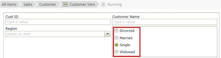 The Radio Button List control allows you to select a single item from a list of values. Use the control when you want a standard layout where the buttons are visually grouped together. If you need to separate radio buttons on the form but keep them related, use the Radio Button and Radio Button Group controls.