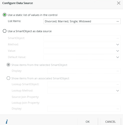 When you click on the ellipsis next to Data Source > Type in the control's Properties, the Configure Data Source page opens. You can use a SmartObject or a static list of values.