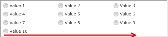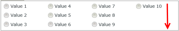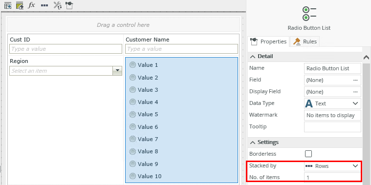 | Stacked by | Specify how to display the items. You can choose between rows and columns. The property defaults to rows. See the Radio Button List items per row or column section for more information. | Yes, see Configure the Set a Control's Properties Action for more information. |