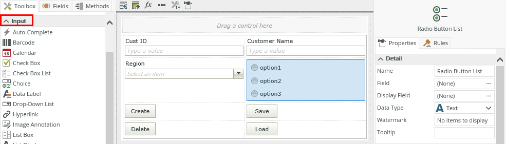 - Drag the control onto the canvas. You can find the control in the Input section of the Toolbox.