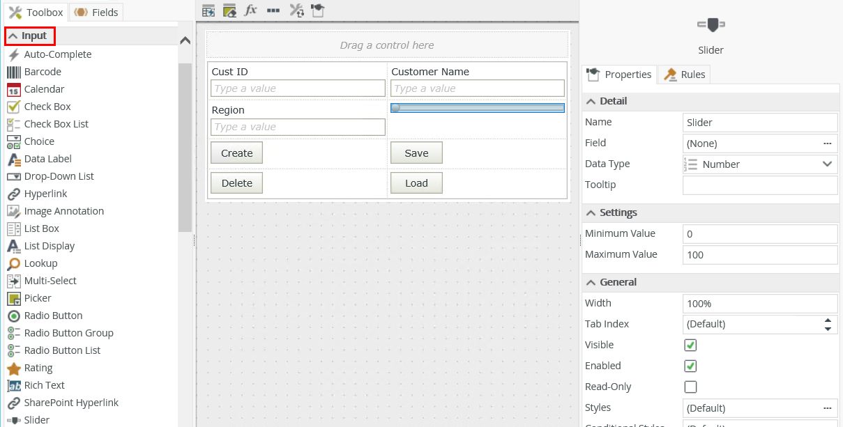 - Drag the control onto the canvas. You can find the control in the Input section of the Toolbox.