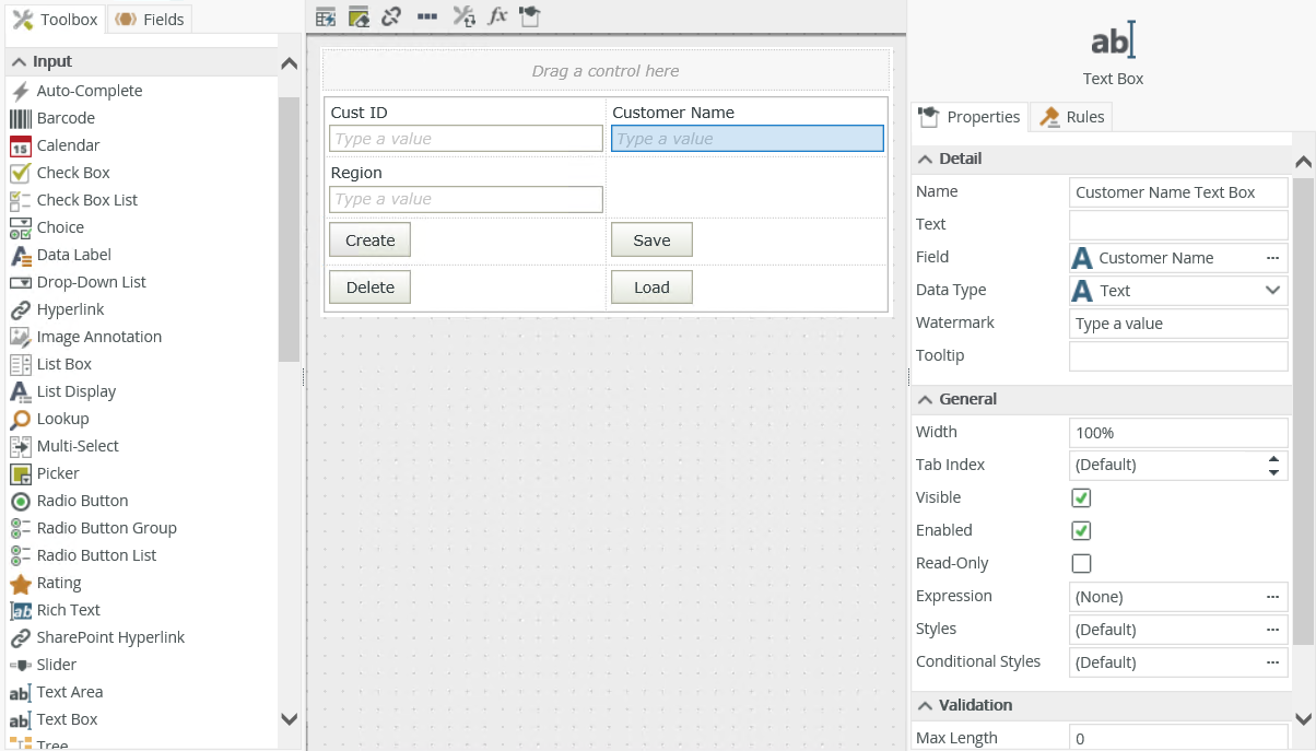 - Drag the control onto the canvas. You can find the control in the Input section of the Toolbox.