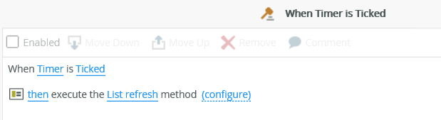 - Create and configure rules to execute the control's events and methods such as the Execute a control's Start method action and When [control] is Ticked event. You have to configure a rule containing the Execute a control's Start method action before a rule containing the When [control] is Ticked event to start the timer. In the example below the timer starts when the view is initialized. The timer ticks using the value of the Interval and executes a list refresh at the interval frequency for the Number of Ticks configured, for example every 2000 milliseconds for 5 ticks.