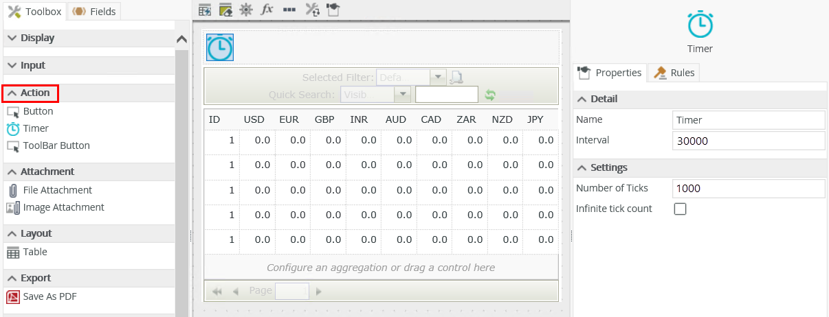 The Timer control allows you to repeatedly execute a rule after an interval. The control is not a display control and is not shown at runtime on the view or form. You must configure this control when you're designing the view or form and configure rules to handle the events and methods of the control. You can use the control to keep track of the time spent on a specific form, for example, counting the seconds lapsed once a form is run. You can also use it to refresh a list of values or data at a frequency without user intervention, for example share prices, and Twitter and RSS feeds. See How To: Automatically Refresh Data on a View with a Timer Control for more information about using the Timer control to refresh data on a view at set intervals.