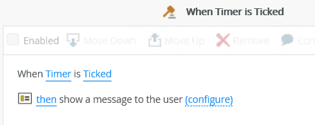- When [control] is Ticked: execute a rule when the timer "ticks". "Ticks" are controlled by the Number of Ticks and Interval properties.