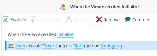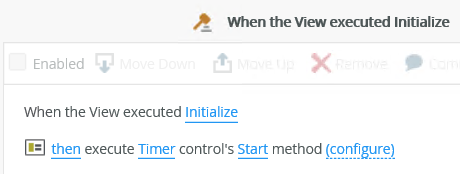 In the example above, the When [control] is Ticked event executes when the view is initialized. - Execute a control's Stop method: Stops the When [control] is Ticked event.