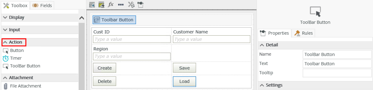 - Drag the control onto the canvas. You can find the control in the Action section of the Toolbox.