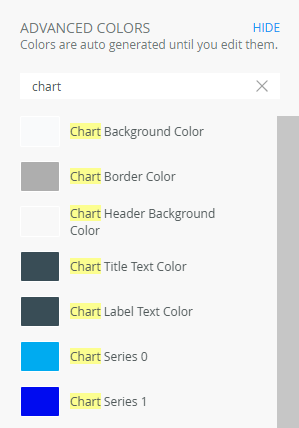 You can use variables in the Advanced section of the Style Profile Designer to apply styles to chart series, legend, category axis, value axis and more. Search for these by typing chart as shown below. This styling is limited to the Dynamic theme.