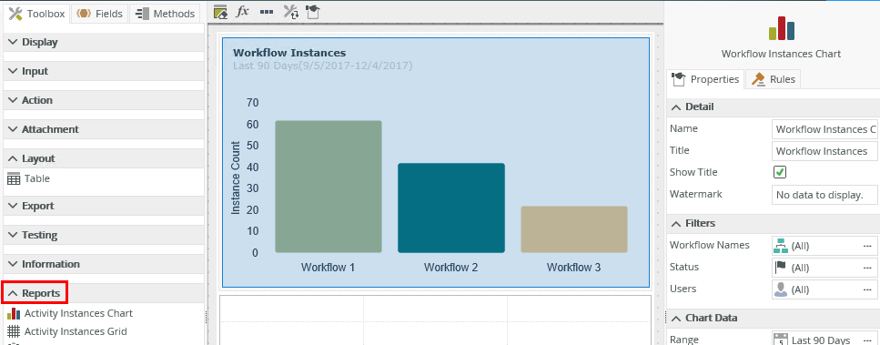 - The value of the chart is the fully qualified name of the workflow on the x-axis. When you click a bar, pie slice, or column (depending on the type of chart) in runtime, the value of the chart is the name of the workflow selected which you can use to bind properties or configure rules.