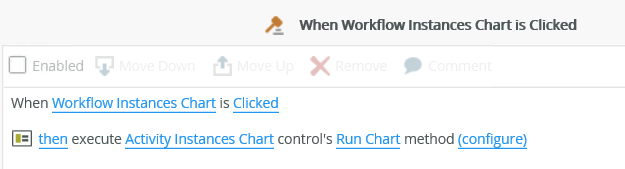 - When you click on a bar, pie slice, or column (depending on the type of chart) of a Workflow Instance Chart you can use the workflow representing the item you click to populate an Activity Instances Chart. You can also set the Title of the Activity Instances Chart with the name of the workflow. To do this, configure the following rule: