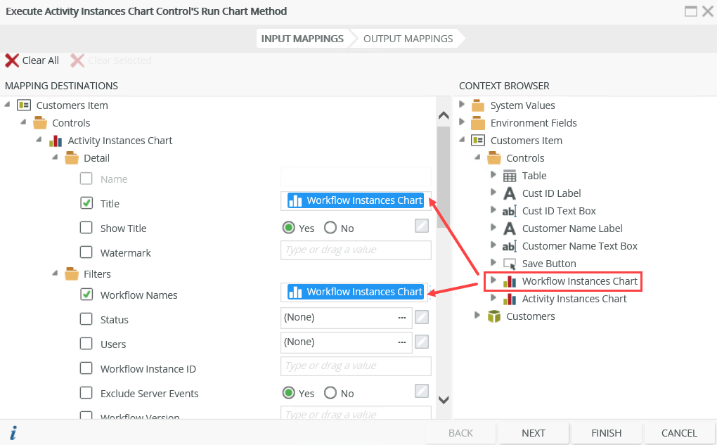 Configuration: Map the Workflow Instances Chart to the Title and Workflow Names properties of the Activity Instances Chart