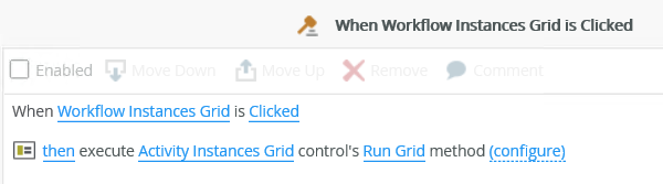 - You can configure a rule to use one grid control to populate another grid control, for example when you click a workflow in a Workflow Instances Grid, an Activity Instances Grid is populated. To do this, configure the following rule:
