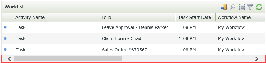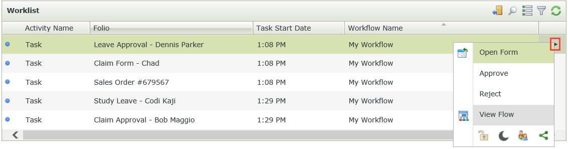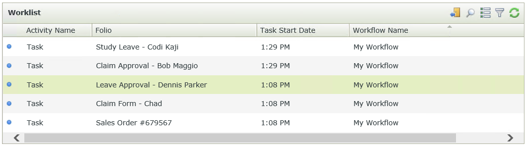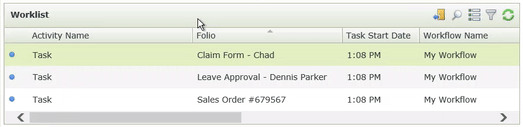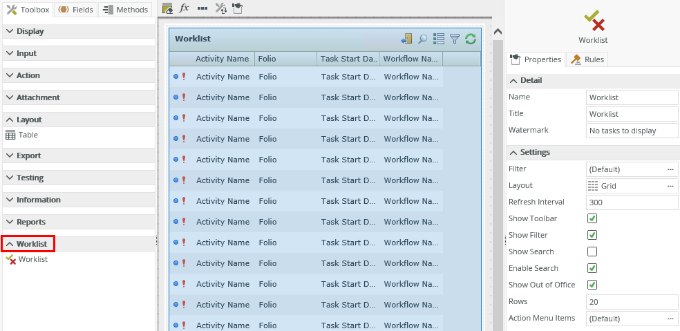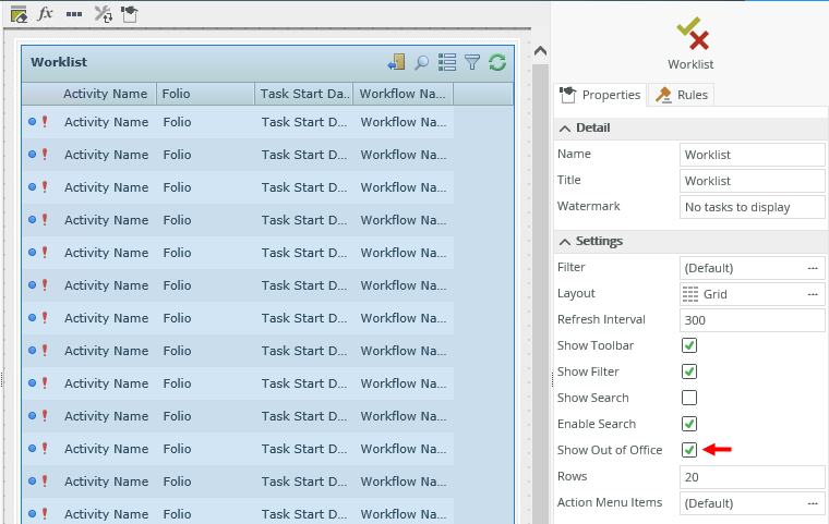 The Worklist control shows a list of workflow tasks assigned to you. You can create custom task lists by adding the control to a view or form to enable opening or actioning workflow tasks. You can customize the control in the Designer by configuring items such as the layout to change the display of the columns, add filters to show tasks related to a specific workflow, and configure sort options. You use the Worklist at runtime to perform actions such as share, redirect or sleep tasks. You can also configure out of office settings to share your tasks with other people while you are out of office. The functionality of the Worklist control is similar to the task list found in Workspace (Desktop). For more information on the features of the Workspace Task List, see the My Tasks topic.
