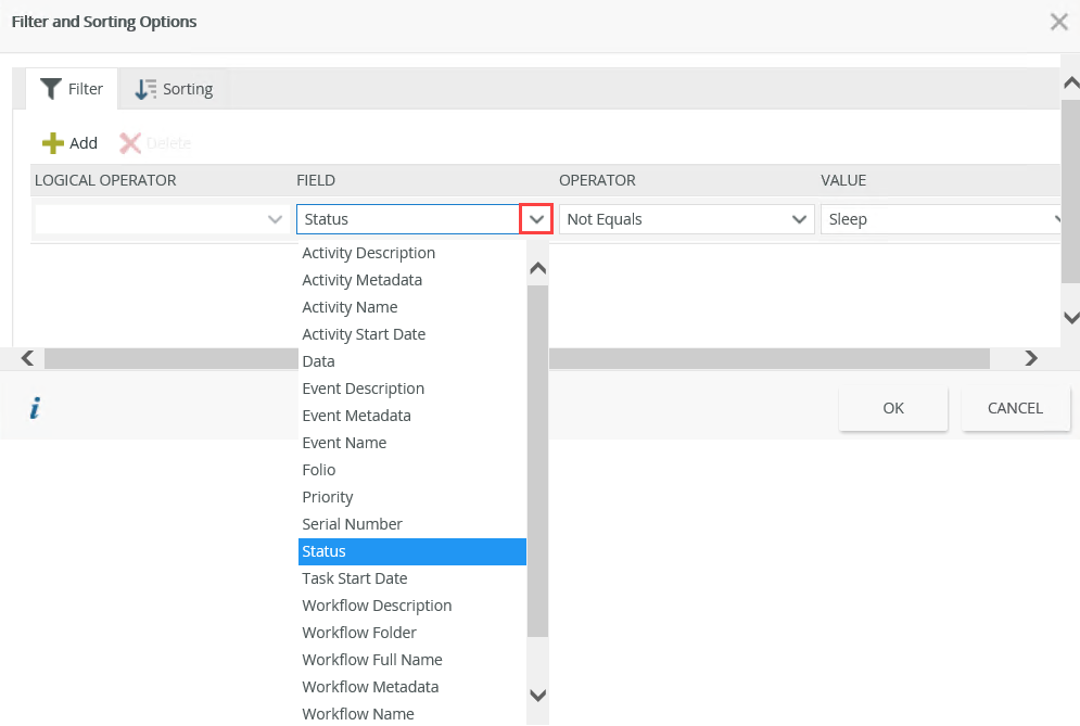 When you click the ellipsis next to the Filter property, the Filter and Sorting Options dialog opens. You can configure one or more filters at design time to create worklists based on tasks related to a specific workflow or set of workflows, or where the status matches a particular value. You can also change the filter while using the control. This represents a personal filter, and applies only to you, not others who may have the form open. If you open a new browser session and browse to the same form containing the worklist, the filter that you created still applies.