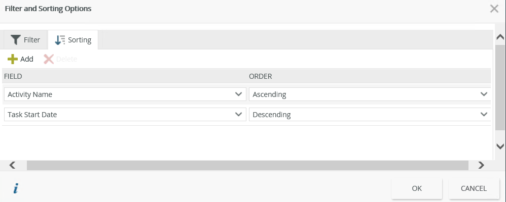 When you select the Sorting tab of the dialog, you can configure one or more sorting options. The sorting is applied in the order listed, so the first one is the primary sort applied, the second one is secondary, and so on.