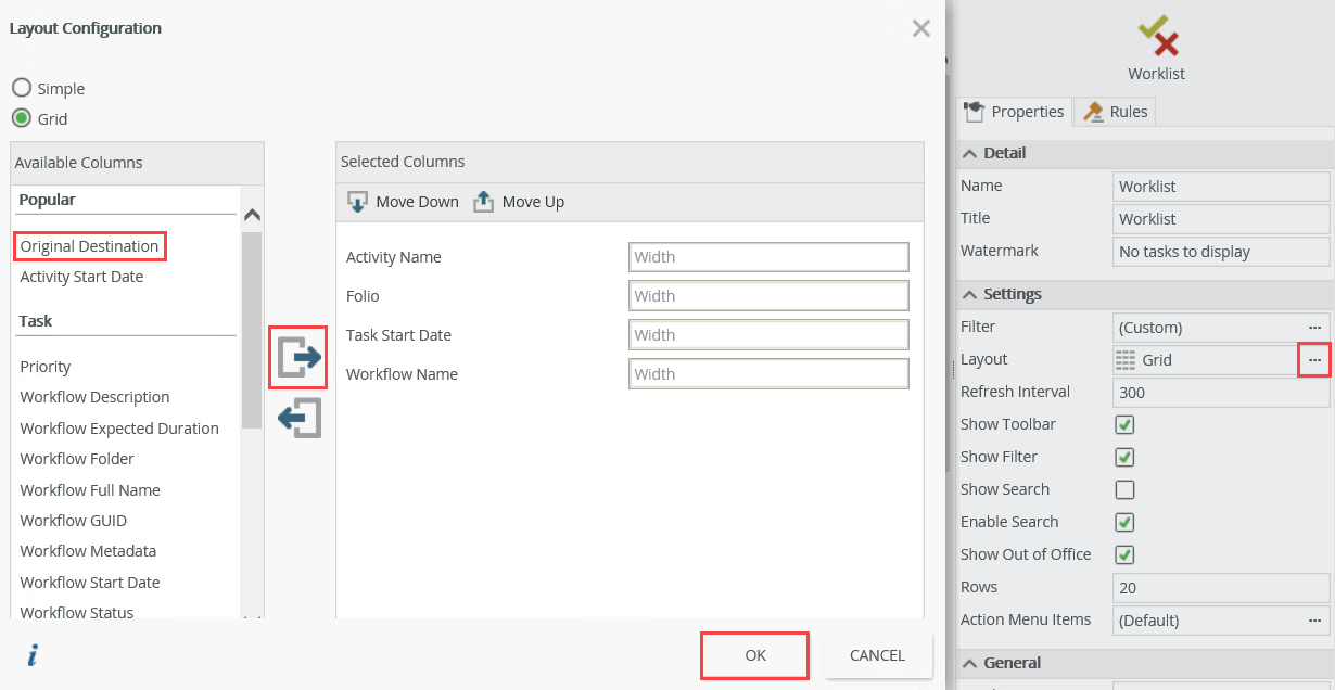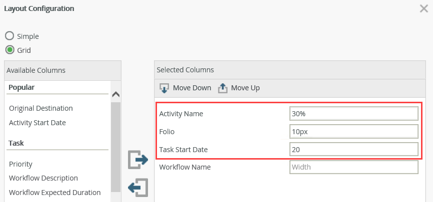 When you click the ellipsis next to the Layout property, the Layout Configuration dialog opens. The Simple option displays the Activity Name, Folio, Task Start Date and Workflow Name columns. To customize the display of the columns, select the Grid option to add and remove columns. Reorder columns using the Move Up and Move Down buttons. You can add an additional column such as the Original Destination. This column allows you to differentiate between your worklist items and someone's shared worklist items allocated to you.