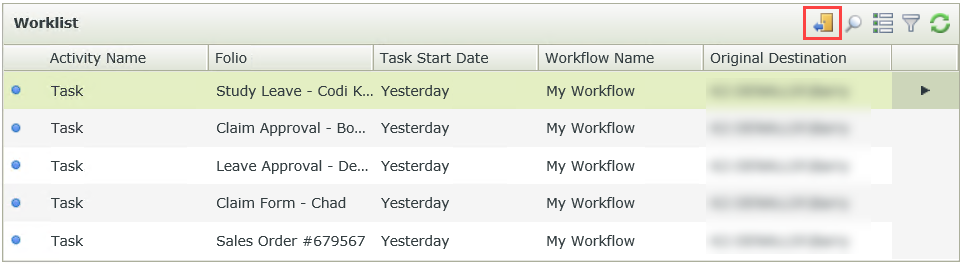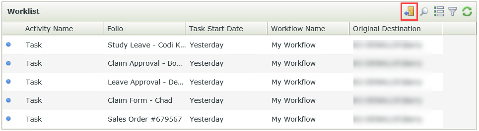 The Out of Office feature allows you to share specific tasks or all tasks assigned to you with people you designate, or you can alternatively create exception rules for specific worklist items when you are out of office. When other people share their out of office worklist items with you, you can use the worklist's Original Destination column to differentiate between your own worklist items and out of office tasks shared with you.
