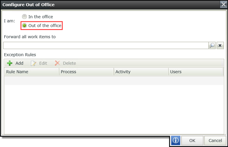 When you configure the out of office settings, you need to assign people to receive your existing and new worklist items. You can configure the out of office settings yourself, or it can be done by your manager or an administrator who has the permissions to do so.