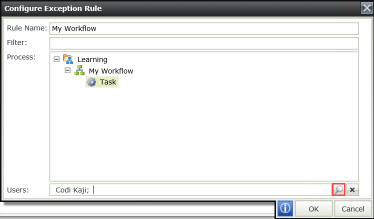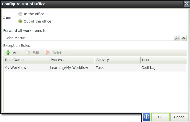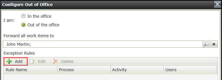 - Optional: If you want to assign a specific activities' tasks to another person, create an exception rule by clicking Add in the Exception Rules section of the configuration dialog.