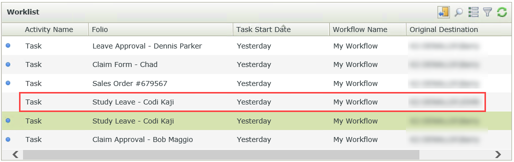 | Original Destination | Allows you to differentiate between your worklist items and an absent (out of office) user's worklist items | Configure recipients of a task in the Recipients tab |