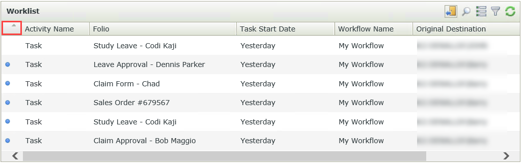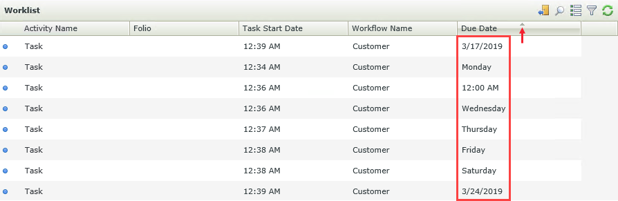 When you add the Due Date column, you can sort worklist tasks according to the date they should be completed. See Task Tab Due Date. You can sort the column in ascending or descending order by clicking the arrow as shown below. Sorting it ascending allows you to see the tasks that you should complete first. The Due Date displays the name of the day for the current week with the exception of today which shows only the time. Tasks with a due date outside of the current week show in date format. When you hover over a current week task, you see the date in the tooltip. The following example shows a worklist when the current day is a Tuesday and the list is sorted ascending: