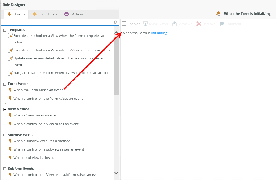 - Initializing - While you can see this event in the Rule Designer, it has been deprecated. Instead use the When the View/Form Initialize event.