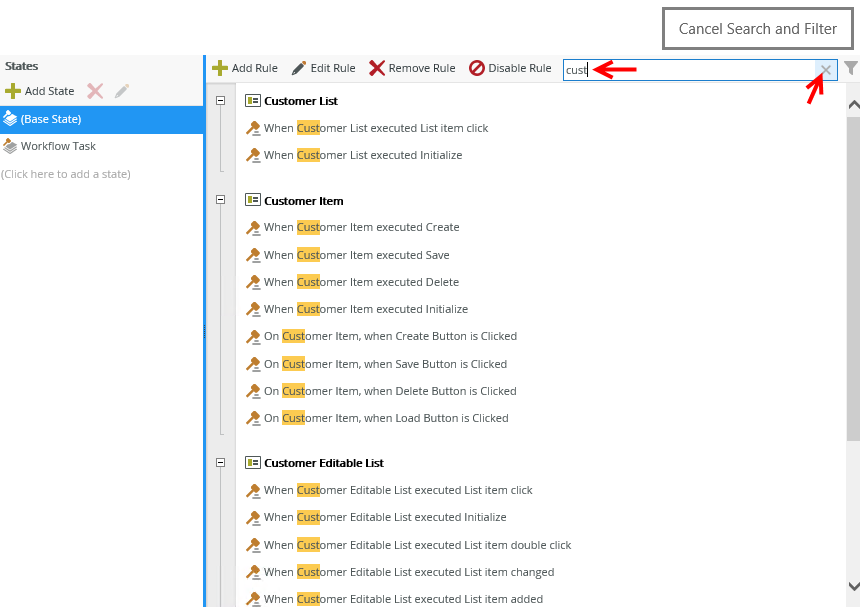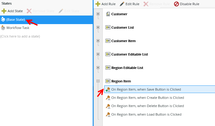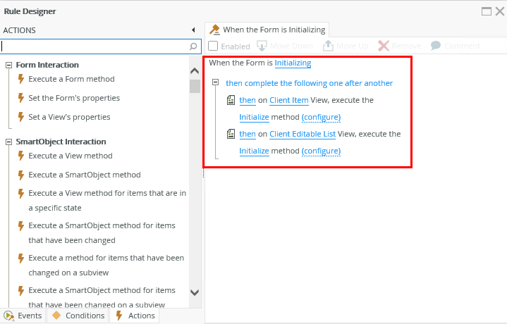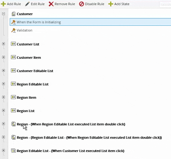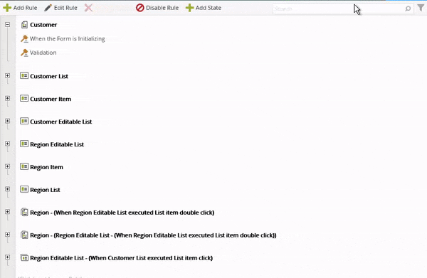 You can create rules to respond to and control user interaction with controls, views and forms. Use rules to create basic and complex business logic in views and forms. The different components of a rule define when (event) something happens on the view or form, if (condition) it should occur, and what (action) happens. One example is to populate a control when a view initializes (opens).