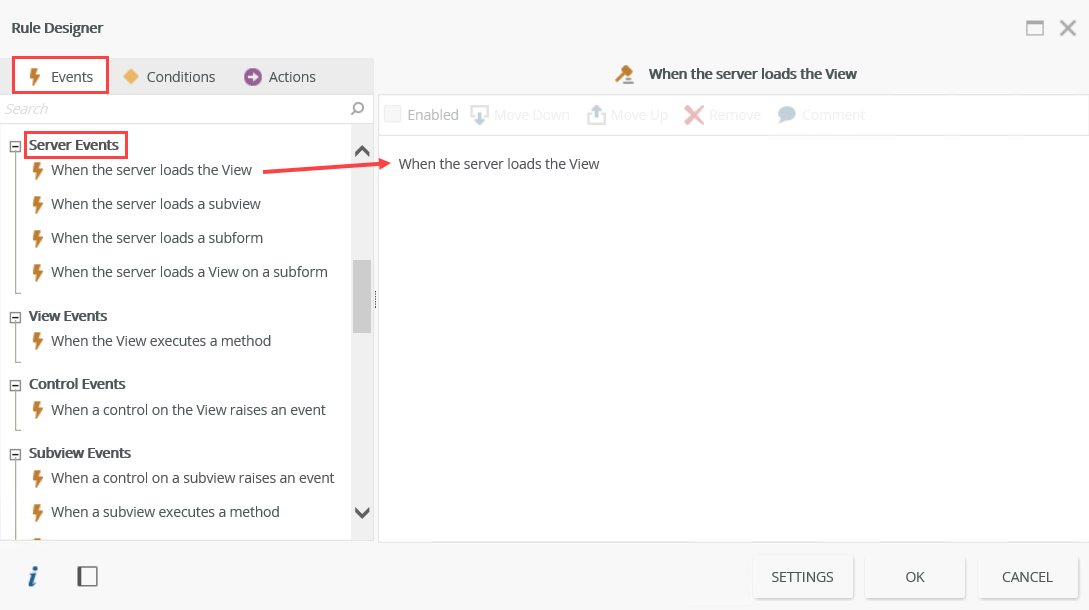 | Server Events | When the server loads the View | Enable a control when the server loads the view |