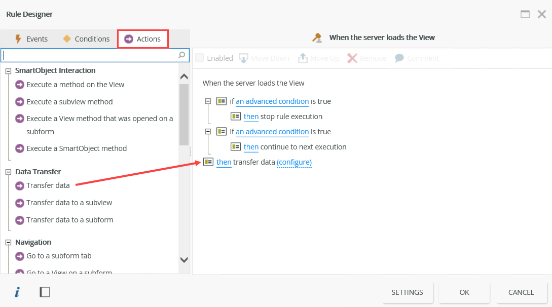 You can find the available server rule actions in the Actions tab of the Rule Designer. (Remember that server actions are filtered and show only those actions that are supported by the server event.) One example is to transfer data as shown below. Click the dotted line to configure the action.