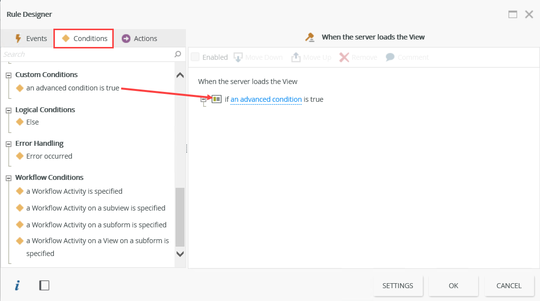 - You cannot change an existing client-side rule to a server-side rule by merely selecting the When the server loads… event, because server-side rules do not support all the conditions, actions and context browser items as client-side rules. If you want to configure an existing view or form to use server-side rules, it is recommended that you create a new rule, select the server-side rule event, and then rebuild the conditions and actions based on the logic in the existing Initialize or Initialized rule. You can then disable or delete the original rule once the server-side rule is complete. See Creating a Server-Side Rule for more information.
