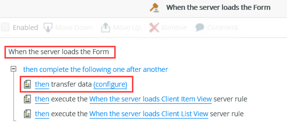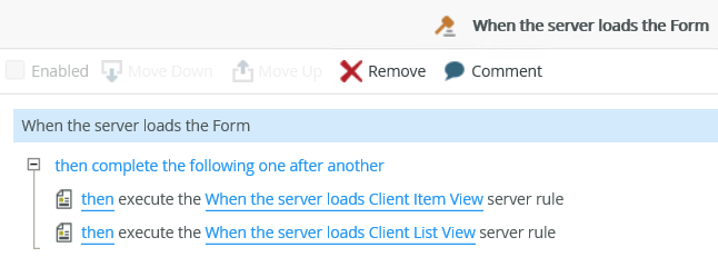- If you create a server rule on a view and you put that view on a form, you have to create a form server load rule to execute the view server load rule on the form. You can do this conditionally and/or specify the order. The example below shows the When the server loads Client Item View and When the server loads Client List View rules executing one after another when the server loads the form.