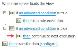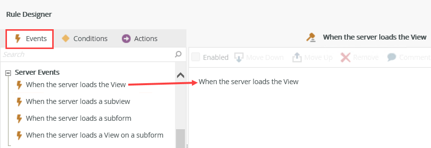 - When you use server load rules, you must set up the event, condition and actions on the same level, for example when you use the When the server loads the View event, you must select the condition and action for a view. You cannot select a condition or action for a form, subview or subform.