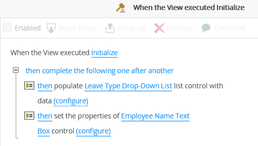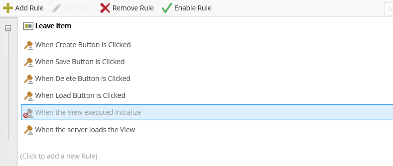 The example below shows how to replace an auto-generated Initialize rule of a Leave Item view with an equivalent server-side rule to perform the necessary load actions on the server, rather than on the client. In this example, you will replicate the rules in the When the View executed Initialize event with equivalent rules in the When the server loads the View event, and then switch the view to use the server-side rules when loading the view.