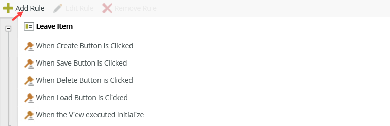 - Edit the Leave Item view, go to the Rules tab and click Add Rule.
