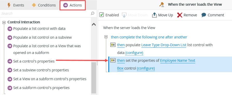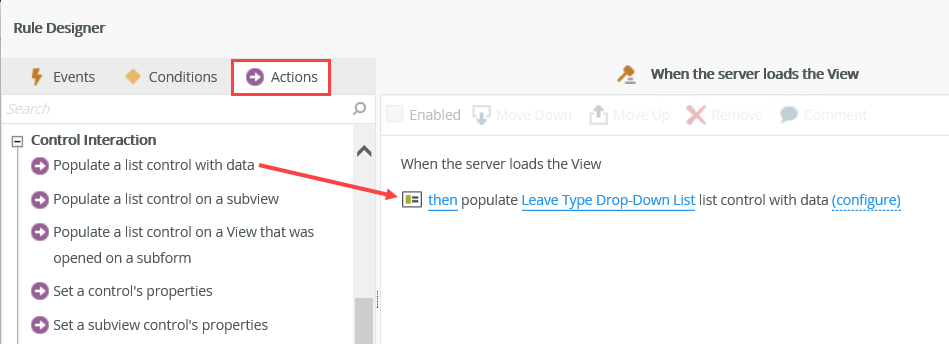 - In the Actions tab, click Populate a list control with data in the Control Interaction group and select the Leave Type Drop-Down List control.