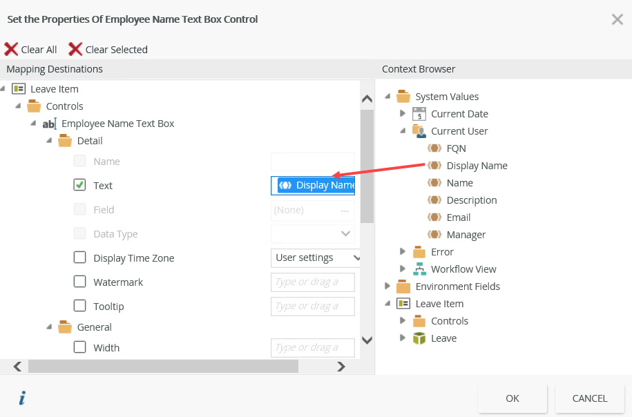 - In the Context Browser, expand System Values>Current User, then drag the Display Name into the Text property as shown below. Click OK.