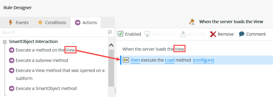 | SmartObject Interaction | Execute a View method | Execute a SmartObject method, such as Create or Load. |