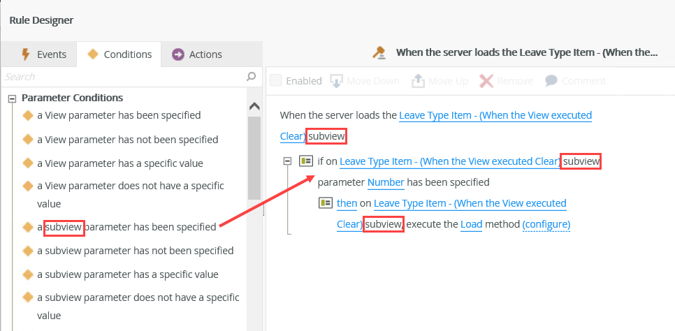 | Parameter Conditions | a subview parameter has been specified | Execute a rule if a subview parameter is not blank, such as if Manager is true, then enable the Manager Comments control. |