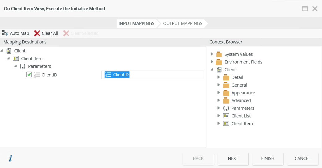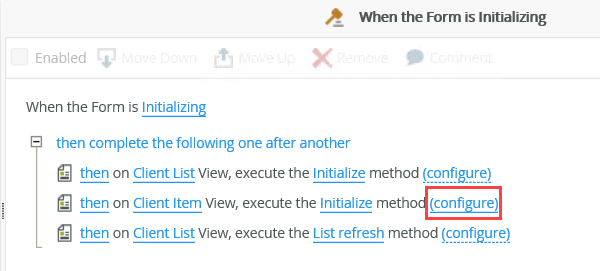 If your Initialize rule is configured with an input mapping, you can use the transfer data action to replicate this mapping in the When the server loads the Form rule. The example below shows the When the Form is Initializing rule with a then on Client Item View, execute the Initialize method.