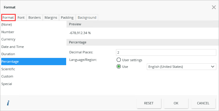 | Percentage | Applies percentage formatting to the control. You can specify a Language/Region and the number of decimal places. |