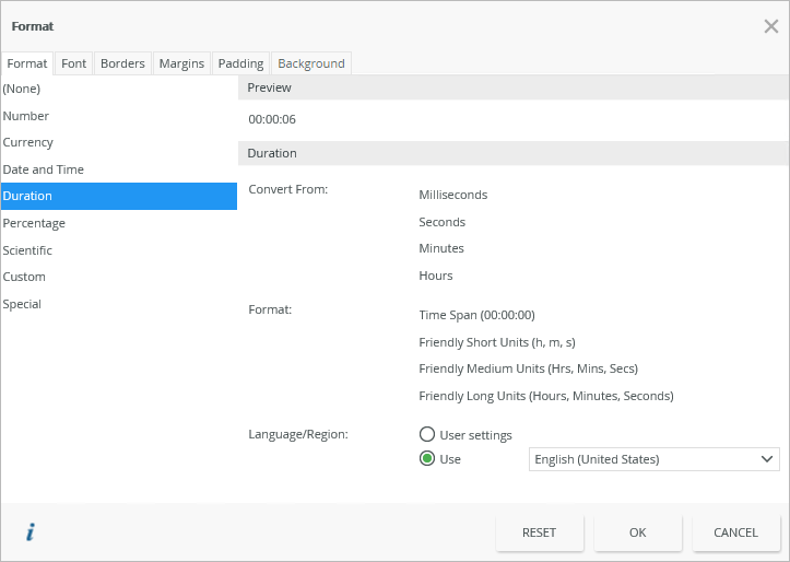 | Duration | Applies duration formatting to the control. You can specify a Language/Region, source units to convert from, and the duration format. |