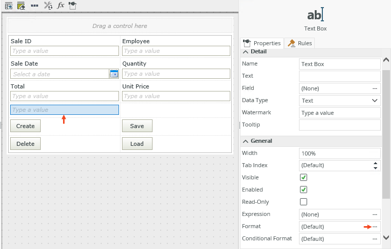 - Select the control and then click the ellipses (...) next to the Format property as shown below.