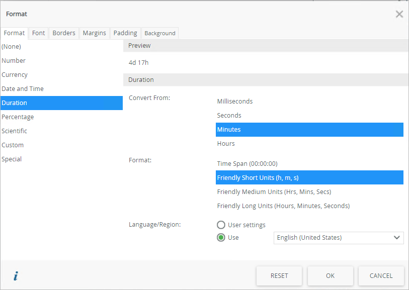 - On the Format page, select the Duration option on the Format tab. Choose a Convert From and Format option. This example uses Minutes and Friendly Short Units.