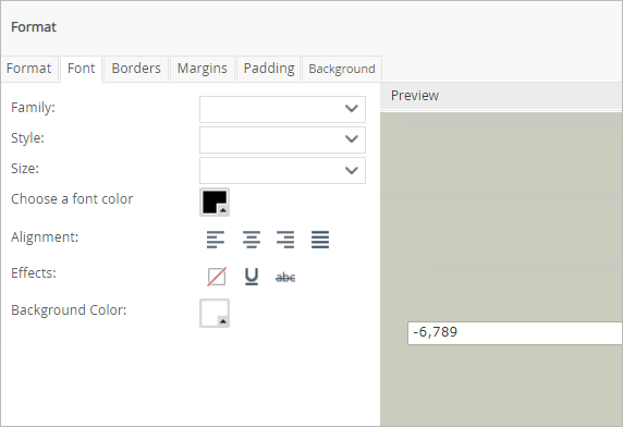 Apply font features such as style, size, effects and more to a control using the Font tab. You can also apply background color to a cell or form.