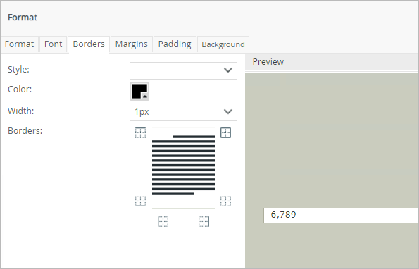 Apply border features such as style, color, width and borders to a control or table using the Borders tab.